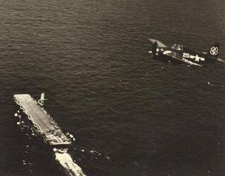 | Keywords: FM-2 VC-93 Petrof Bay 1945.jpg A U S Navy Grumman FM-2 Wildcat fighter of composite squadron VC-93 flying over its parent carrier the escort carrier USS Petrof Bay CVE-80 in 1945 VC-93 operated from the Petrof Bay between 10 March and 30 May 1945 in support of the invasion of Okinawa Official U S Navy photograph on navsource org http //www navsource org/archives/03/0308005 jpg 1945 Photographer Robert M Cieri PD-USGov-Military-Navy General Motors FM-2 Wildcat USS Petrof Bay CVE-80 | ||||