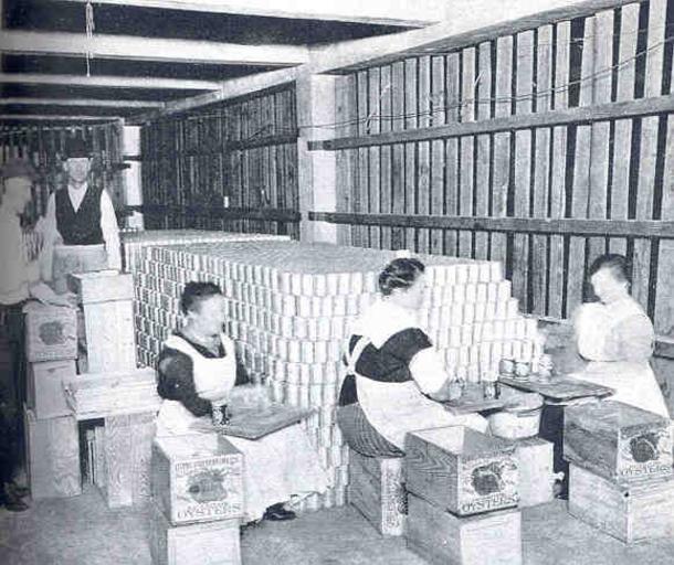 Keywords: FMIB 34844 Interior of Oyster Cannery- Labeling and Boxing Cans of Oysters.jpeg check categories 18 September 2015 4 Interior of Oyster Cannery Labeling and Boxing Cans of Oysters Subject Fishery processing Oyster fisheries Canneries Women Fish Trade Workers Tag Commercial Fisheries 1919 Cite book Oyster and the Oyster Industry of the Atlantic and Gulf Coasts Report of the United States Commissioner of Fisheries 1919 Churchill E P Washington DC Government Printing Office 1919 Plate XXVIII-1 E N Cory PD-UWASH-FMIB Institution University of Washington FMIB-source accession number 34844 Images from the Freshwater and Marine Image Bank to check E N Cory Fisheries Oyster culture Canneries |