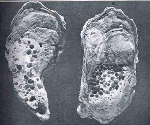 | Keywords: FMIB 34896 Oyster Shells Showing Pits and Chambers Made by Boring Clam.jpeg Oyster Shells Showing Pits and Chambers Made by Boring Clam Subject Oysters Clams Tag Shellfish 1919 Cite book Oyster and the Oyster Industry of the Atlantic and Gulf Coasts Churchill E P Washington DC Government Printing Office 1919 Report of the United States Commissioner of Fisheries 1919 Plate X-2 Moore PD-UWASH-FMIB Institution University of Washington FMIB-source accession number 34896 Images from the Freshwater and Marine Image Bank to check Unidentified Bivalvia |