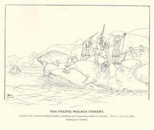 | Keywords: FMIB 35857 Pacific Walrus Fishery.jpeg check categories 1 September 2015 5 Pacific Walrus Fishery Innuits of St Lawrence Island Alaska surprising and harpooning a herd of walruses Subject Sealing industry Inuit--Alaska Geographic Subject United States--Alaska--St Lawrence Island Tag Aquatic Mammals Traditional Fisheries 1887 Cite book Fisheries and Fishery Industries of the United States Section V History and Methods of the Fisheries v 2 Goode George Brown Washington DC Government Printing Office 1887 Plate 214 Creator Henry Wood Elliott PD-UWASH-FMIB Institution University of Washington FMIB-source accession number 35857 Images from the Freshwater and Marine Image Bank to check Henry W Elliott Seal hunting Marine mammals Fisheries Saint Lawrence Island |