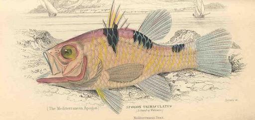| Keywords: FMIB 36076 Apogox Trimaculatus (The Mediterranean Apogon).jpeg Apogox Trimaculatus The Mediterranean Apogon Island of Vulcano Mediterranean Seas Subject Perch Apogon Tag Fish 1843 Cite book Fishes of the Perch Family Jardine William Edinburgh Scotland W H Lizars 1843 Naturalist's Library vol XXXVIII Facing page 116 Creator William Jardine PD-UWASH-FMIB Institution University of Washington FMIB-source accession number 36076 Images from the Freshwater and Marine Image Bank to check William Jardine Pristicon trimaculatus |