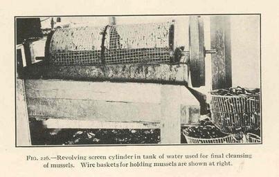 | Keywords: FMIB 39044 Revolving screen cylinder in tank of water used for final cleansing of mussels Wire baskets for holding mussels are shown at.jpeg check categories 8 September 2015 2 Revolving screen cylinder in tank of water used for final cleansing of mussels Wire baskets for holding mussels are shown at right Subject Mussel fisheries--Equipment and supplies Tag Shellfish 1923 Cite book Biology and Economic Value of the Sea Mussel Mytilus edulis Field Irving A Washington DC Government Printing Office 1923 Bulletinof the United States Bureau of Fisheries vol 38 1921-1922 Fig 226 Creator Irving Angell Field PD-UWASH-FMIB Institution University of Washington FMIB-source accession number 39044 Images from the Freshwater and Marine Image Bank to check Irving Angell Field Shellfish |