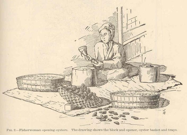 Keywords: FMIB 40889 Fisherwoman opening oysters The drawing shows the block and opener, oyster basket and trays.jpeg check categories 17 August 2015 2 Fisherwoman opening oysters The drawing shows the block and opener oyster basket and trays Subject Women fish trade workers Oyster industry--Japan Fishery processing Tag Traditional Fisheries 1904 Cite book Japanese Oyster-Culture Dean Bashford Washington DC Government Printing Office 1904 Bulletin of the United States Fish Commission vol 22 1902 Fig 2 Creator Bashford Dean PD-UWASH-FMIB Institution University of Washington FMIB-source accession number 40889 Images from the Freshwater and Marine Image Bank to check Bashford Dean Fisheries |