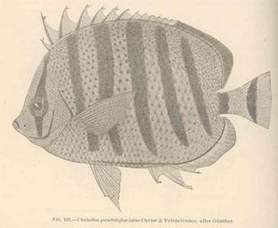 | Keywords: FMIB 42521 Chaetodon punctatofasciatus Cuvier & Valenciennes; after Gunther.jpeg Chaetodon punctatofasciatus Cuvier Valenciennes; after Gunther Subject Chaetodontidae Tag Fish 1905 Cite book Shore Fishes of the Hawaiian Islands with a General Account of the Fish Fauna Jordan David Starr; Evermann Barton Warren Washington DC Government Printing Office 1905 Bulletin of the United States Fish Commission vol 23 for 1903 part I Fig 162 Creator David Starr Jordan Creator Barton Warren Evermann PD-UWASH-FMIB Institution University of Washington FMIB-source accession number 42521 Images from the Freshwater and Marine Image Bank to check David Starr Jordan Barton Warren Evermann Chaetodon punctatofasciatus |