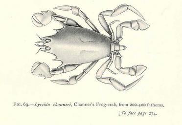 | Keywords: FMIB 45482 Characteristic Deep-Sea Crustaceans.jpeg check categories 23 August 2015 4 Characteristic Deep-Sea Crustaceans Lyreidu channeri Channer's Frog-crab from 200-400 fathoms Subject Crabs Lyreidu Tag Shellfish 1902 Cite book Naturalist in Indian Seas or Four Years with the Royal Indian Marine Survey Ship 'Investigator' Alcock Alfred W New York City NY E P Dutton Co 1902 Fig 69 Creator Alfred William Alcock PD-UWASH-FMIB Institution University of Washington FMIB-source accession number 45482 Images from the Freshwater and Marine Image Bank to check Alfred William Alcock Brachyura Lyreidus |