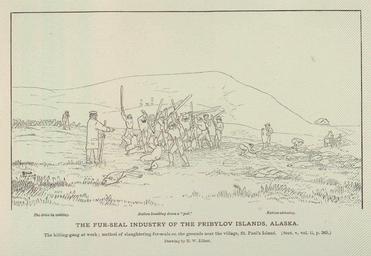 | Keywords: FMIB 46003 Fur-Seal Industry of the Pribylov Islands, Alaska.jpeg Fur-Seal Industry of the Pribylov Islands Alaska The killing-gang at work; method of slaughtering fur-seals on the grounds near the village St Paul's Island Subject Sealers Saint Paul Island Alaska Northern fur seal Sealing Geographic Subject United States--Alaska--Saint Paul Island Tag Aquatic Mammals 1887 Cite book Fisheries and Fishery Industries of the United States Goode George Brown Washington DC Government Printing Office 1887 Plate 225 Creator Henry Wood Elliott PD-UWASH-FMIB Institution University of Washington FMIB-source accession number 46003 Images from the Freshwater and Marine Image Bank to check Seal hunting Saint Paul Island Alaska Callorhinus ursinus Fur-Seal Industry of the Pribylov Islands Alaska |