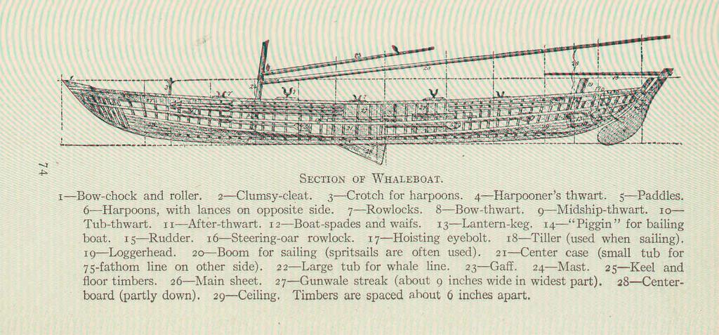 Keywords: FMIB 47504 Section of Whaleboat.jpeg check categories 21 August 2015 2 Section of Whaleboat 1-Bow-chock and roller 2-Clumsy-cleat 3-Crotch for harpoons 4-Harpooner's thwart 5-Paddles 6-Harpoons with lances on opposite side 7-Rowlocks 8-Bow-thwart 9-Midship-thwart 10-Tub-thwart 11-After-thward 12-Boat-spades and waifs 13-Lantern-ket 14-Piggin' for bailing boat 15-Rudder 16-Steering-oar rowlock 17-Hoisting eyebolt 18-Tiller used when sailing 19-Loggerhead 20-Boom for sailing spritsails are often used 21-Center case small tub for 75-fathom line on other side 22-Large tub for whale line 23-Gaff 24-Mast 25-Keel and floor timbers 26-Main sheet 27-Gunwale streak about 9 inches wide in widest part 28-Center-boart partly down 29-Ceiling Timbers are spaced aobut 6 inches apart Subject Whaleboats Tag Vessels 1916 00 Cite book Real Story of the Whaler Whaling Past and Present Verrill A Hyatt Alpheus Hyatt New York City NY D Appleton and Company 1916 74 Creator Alpheus Hyatt Verrill PD-UWASH-FMIB Institution University of Washington FMIB-source accession number 47504 Images from the Freshwater and Marine Image Bank to check Alpheus Hyatt Verrill Whaleboats |