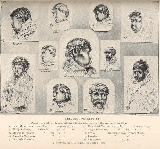 | Keywords: FMIB 47656 Creoles and Aleutes - Pencil Portraits of typical Alaskan faces, selected from the Author's portfolio.jpeg check categories 21 August 2015 1 Creoles and Aleutes Pencil Portraits of typical Alaskan faces selected from the Author's portfolio 1 Luka Mandriggan an Aleute 49 years of age 9 Philip Vollkov a Creole 50 yers of age 8 Matroona Volikov a Creole girl 15 years of age 10 Anoorka Meseekin a Creole Girl 11 ears of age Fevronia Eevanov a creole girl 9 years of age 11 Deemietri Veatkin a creole 48 years of age 6 Aggie Kooshing A Creole boy 18 years of age 3 Ivan an aleute boy 7 years of age 5 Domian an Aleute boy 12 years of age 2 Paraskeeva an Aleute girl 13 years of age 4 Natalia an Aleute girl 12 years of age Subject Aleuts Mandriggan Luka Vollkov Philip Vollkov Matroona Meseekin Anoorka Eevanov Fevronia Veatkin Deemietri Kooshing Aggie Indians of North America Tag People 1897 00 Cite book Our Arctic Province Alaska and the Seal Islands Elliott Henry W New York City NY Charles Scribner's Sons 1897 Library of Contemporary Exploration and Adventure Facing page 108 Creator Henry Wood Elliott PD-UWASH-FMIB Institution University of Washington FMIB-source accession number 47656 Images from the Freshwater and Marine Image Bank to check Henry W Elliott |
