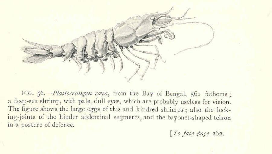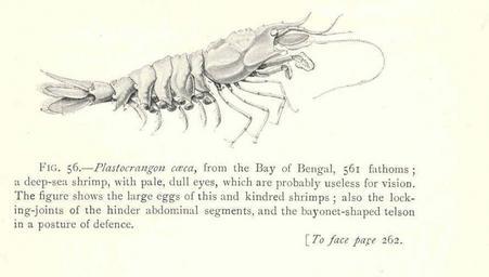 | Keywords: FMIB 47678 Purblind Crustaceans.jpeg Purblind Crustaceans Plastocrangon caeca from the Bay of Bengal 561 fathoms; a deep-sea shrimp with pale dull eyes which are probably useless for vision The figure shows the large eggs of this and kindred shrimps; also the locking-joints of the hinder abdominal segments and the bayonet-shaped telson in a posture of defence Subject Shrimps Plastocrangon Tag Shellfish 1902 00 Cite book Naturalist in Indian Seas or Four Years with the Royal Indian Marine Survey Ship 'Investigator' Alcock Alfred W New York City NY E P Dutton Co 1902 Fig 56 Creator Alfred William Alcock PD-UWASH-FMIB Institution University of Washington FMIB-source accession number 47678 Images from the Freshwater and Marine Image Bank to check Alfred William Alcock |