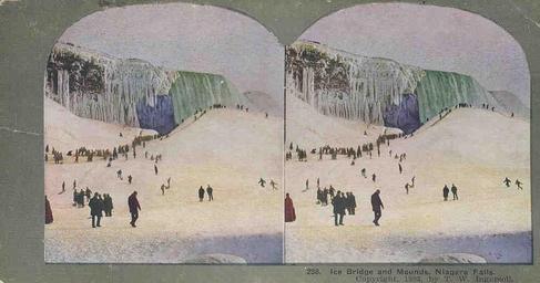 | Keywords: FMIB 47746 Ice Bridge and Mounds, Niagara Falls.jpeg check categories 19 September 2015 1 Ice Bridge and Mounds Niagara Falls The grandeur and loveliness of the Niagara Falls is replaced in winter by a not less majestic but more forbidding aspect The mighty sweep of the waters does not allow of any formation of ice in the rapids above or below the falls but at the edges of the river in the shallows mighty columns and pillars of crystal are piled up in the shape of huge mounds on which the snows of heaven descend to add their pure white to the glistening green of the rushing waters the deep purple of the ice behind the flowing cutain and the brilliant hues of the giant icicles reflecting the rays of the sun And however long a visitor may linger new beauties will present themselves and the greater will be his appreciation with every moment Subject Niagara Falls NY and Ont Waterfalls--New York State Waterfalls--Ontario Geographic Subject United States--New York State --Niagara Falls Canada--Ontario--Niagara Falls Tag Limnology 1903 00 Cite book T W Ingersoll 1903 No 238 A8523 Truman Ward Ingersoll PD-UWASH-FMIB Institution University of Washington FMIB-source accession number 47746 Images from the Freshwater and Marine Image Bank to check Niagara Falls Stereographs |