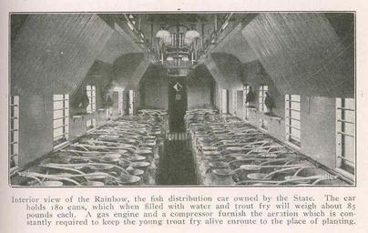 | Keywords: FMIB 47888 Interior view of the Rainbow, the fish distribution car owned by the State The car holds 180 cans, which when filled with water.jpeg check categories 19 August 2015 2 Interior view of the Rainbow the fish distribution car owned by the State The car holds 180 cans which when filled with water and trout fry will weigh about 85 pounds each A gas engine and a compressor furnish the aeration which is constantly required to keep the young trout alive enroute to the place of planting Subject Railroads--Cars Fish stocking Tag Hatcheries 1917 00 Cite book Biennial Report of the Fish and Game Commission of the State of Oregon to the Governor and the Twenty-Ninth Legislative Assembly 1917 Salem Oregon Fish and Game Commission 1917 67 author PD-UWASH-FMIB Institution University of Washington FMIB-source accession number 47888 Images from the Freshwater and Marine Image Bank to check Fish stocking Fish hatcheries |