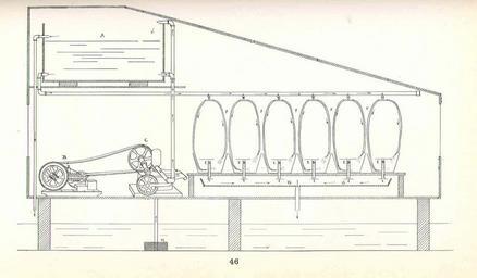 | Keywords: FMIB 48200 Diagram of the method used in experimental hatching of quahaug eggs and rearing of the young larvae at the Wellfleet laboratory.jpeg check categories 17 September 2015 2 Diagram of the method used in experimental hatching of quahaug eggs and rearing of the young larvae at the Wellfleet laboratory It represents a cross-section of the laboratory showing a small 1 1/2 horse power gasoline engine B connected by a belt with a pump C by which salt water is forced from below into a tank A situated near the roof The laboratory is located on a wharf over the water which enables salt water to be obtained directly from beneath the floor The inlet of the pump is guarded by a strainer H which prevents seaweed entering the pipe From the tank the salt water is conducted through the laboratory by a large pipe set with small petcocks From these petcocks pieces of rubber tubing F lead to the hatching tubs E which consist of half barrels fitted with sand filters D The tubs are placed over a sink G which carries off the filtered water By this arrangement a continuous flow of water is established through the hatching tanks Subject Shellfish culture--Massachusetts Laboratories--Wellfleet Massachusetts Tag Shellfish 1912 Cite book Report Upon the Quahaug and Oyster Fisheries of Massachusetts Massachusetts Commissioners on Fisheries and Game Boston MA Wright Potter Printing Co 1912 Fig 46 State of Massachusetts Fish and Game Commission PD-UWASH-FMIB Institution University of Washington FMIB-source accession number 48200 Images from the Freshwater and Marine Image Bank to check State of Massachusetts Fish and Game Commission Shellfish |