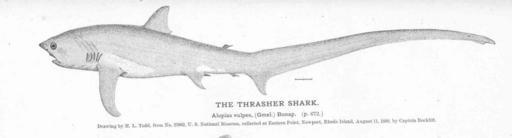 | Keywords: FMIB 51156 Thrasher Shark.jpeg Thrasher Shark Alopias vulpes Gmel Bonap Subject Mackerel sharks Lamniformes Tag Fish 1884 Cite book Fisheries and Fishery Industries of the United States Section I Natural History of Useful Aquatic Animals Plates Goode George Brown Washington DC Government Printing Office 1884 Plate 240 Creator H L Todd PD-UWASH-FMIB Institution University of Washington FMIB-source accession number 51156 Images from the Freshwater and Marine Image Bank to check H L Todd Alopias vulpinus |