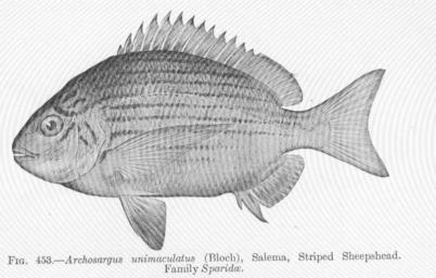 | Keywords: FMIB 52025 Archosargus unimaculatus (Bloch) Salema, Striped Sheepshead Family Sparidae.jpeg Archosargus unimaculatus Bloch Salema Striped Sheepshead Family Sparidae Subject Sparidae Tag Fish 1907 Cite book Fishes Jordan David Starr New York City NY Henry Holt and Company 1907 Fig 453 Creator David Starr Jordan PD-UWASH-FMIB Institution University of Washington FMIB-source accession number 52025 Images from the Freshwater and Marine Image Bank to check David Starr Jordan Archosargus rhomboidalis |