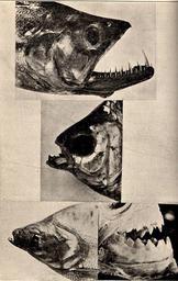 | Keywords: FMIB 52291 Adaptive Radiation in the Characinide The central figure of Atygnax bimaculatus with notched teeth probably represents the more.jpeg Adaptive Radiation in the Characinide The central figure of Atygnax bimaculatus with notched teeth probably represents the more primitive condition The lower lefthand figure represents Anodus latior with no teeth and a very long alimentary canal a mud eater The lower right-hand figure represents the scissor-like jaw and teeth of Serrasaima humeralis whose relatives have been repeatedly reported to have killed bathers before they could reach shore after being attacked The upper figure represents Raphiodon vulpinus Spix which has reached the extreme in conical teeth the large canines protruding above when the jaws are closed The over 100 South American genera and 500 species of this family offer pretty complete series from the center to the txtremes with many lateral branches Subject Characidae Tag Fish 1906 Cite book Fresh-Water Fishes of North and Middle America Eigenmann Carl H Popular Science Monthly June 1906 524 Creator Carl H Eigenmann PD-UWASH-FMIB Institution University of Washington FMIB-source accession number 52291 Images from the Freshwater and Marine Image Bank to check Carl Eigenmann Astyanax bimaculatus |