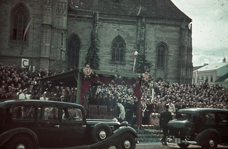 View Original:Fő tér a magyar csapatok bevonulása idején, a Szent Mihály-templom előtti emelvénynél Horthy Miklós. A felvétel 1940. szeptember 11-én készült. Fortepan 92490.jpg (5436x3559)