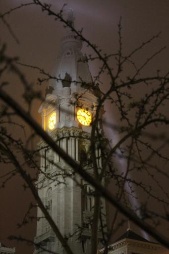 Keywords: fog architecture building windows tree silhouette night clock city philadelphia town hall