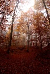Keywords: fog forest autumn red cold mystical mood colourless nature trees forest path
