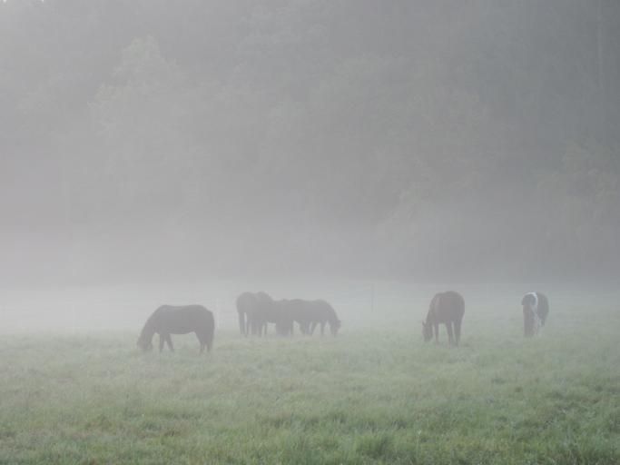 Keywords: fog horses pasture autumn landscape mood atmosphere meadow grass nature morning mist weather freedom
