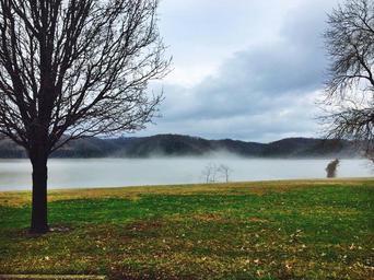 Keywords: fog lake hills tree sky