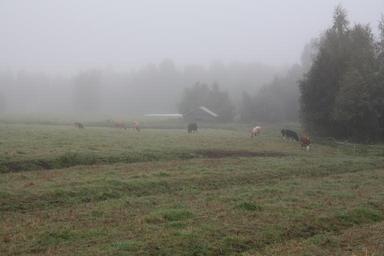 Keywords: fog mist morning cow nature landscape tree foggy barn autumn weather