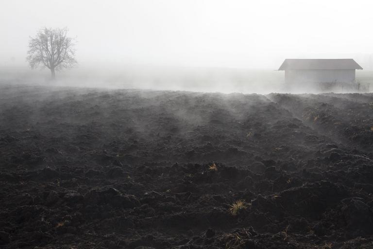 Keywords: fog mood landscape fog bank fog day november arable plowed steam tree barn