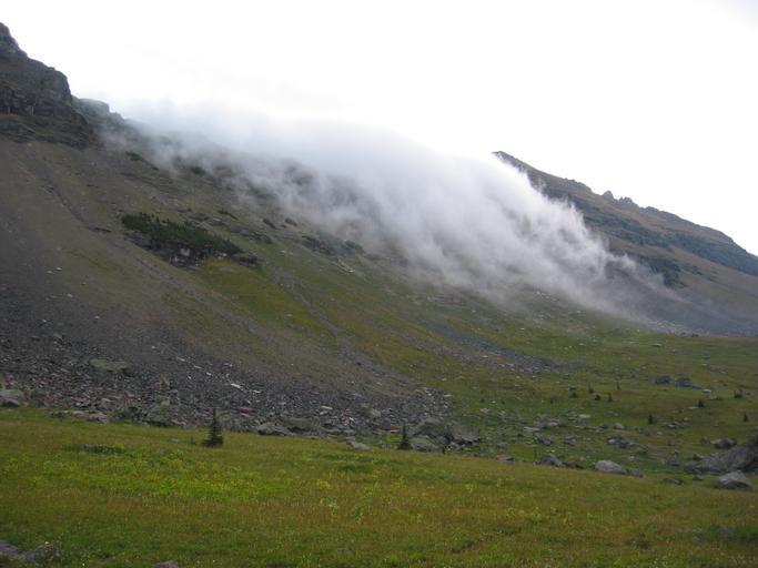 Keywords: glacier national park glaciernationalpark hiking backcountry fifty mountain fiftymountain trail mountains glaciers rocks alpine scenery weather outdoor landscape mountain mountainside hill field grassland Fog drifts over the Continental Divide near Sue Lake Bench, above Fifty Mountain Camp. Photo: David Restivo, NPS Fog drifts over the Continental Divide near Sue Lake Bench, above Fifty Mountain Camp. Photo: David Restivo, NPS