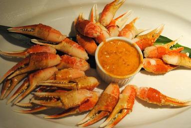 Keywords: food appetizer crab seafood meal fresh cuisine gourmet snack plate plate of food fresh food delicious tasty food plate gourmet food restaurant eat expensive rich crab claws fish orange dipping sauce elegant pricey costly