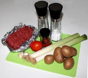 Keywords: food dinner meat vegetables spices potatoes beef leeks meal