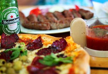 Keywords: food pizza beer restaurant italian lunch sauce mozzarella dough table delicious meal fast food restaurant pepperoni pizza tomato eating italian food salami kebab