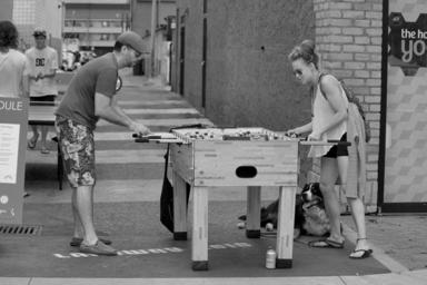 Keywords: blackandwhite black white bw monochrome street streetphotography downtown canada britishcolumbia bc okanagan kelowna foosball table game people blockparty summer alley