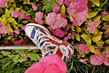 Keywords: foot leg shoe sneaker body body part female person people flowers pose body language