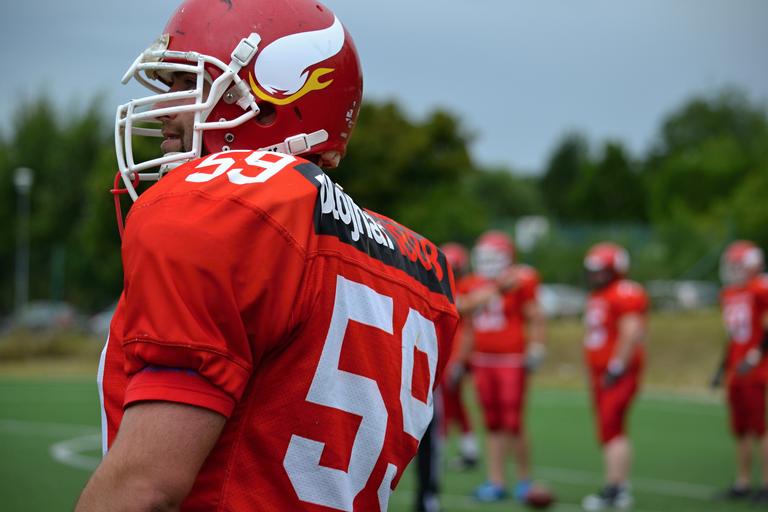 Keywords: football american football helmet red jerseys contact game sport fun charge win determination players rules field