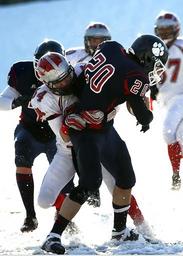 Keywords: football american football tackle runner running back defense team teamwork competition sport game snow ice gridiron high school athlete football player football game helmet ball carrier canadian canada
