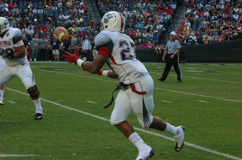 Keywords: football player receiver pass catch ball field stadium athlete goal game competition play action male