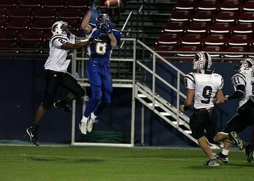 Keywords: football receiver defensive back action reception american ball game team sport competition player catch football game uniform play pass stadium helmet teamwork reaching male high school competitive leaping jumping