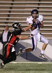 Keywords: football reception catch offense leaping game american football sport player ball competition football game uniform helmet young action competitive determination eyes face mask stadium defender jumping safety