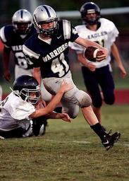 Keywords: football running back player ball carrier competition tackle american back ball sport running gridiron tailback headgear male american football player competitor helmet football field grass turf pigskin holding