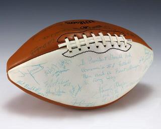 | Keywords: Football signed by 1976 Pitt Panthers (1988.210).jpg en A signed University of Pittsburgh football and includes signatures from coach Johnny Majors the Heisman Trophy winner from that year Tony Dorsett and the rest of the 1976 team The football also includes an inscription to Ford which is featured on the white panel of the football leather 11 1/4 x 7 in 28 6 x 17 8 cm Institution Gerald R Ford Presidential Museum http //www fordlibrarymuseum gov/museum/ArtifactCollectionSamples/Catagories/Presidential 20Footballs/1988 210 html Football signed by 1976 Pitt Panthers accession number 1988 210 credit line Courtesy of the Gerald R Ford Presidential Museum Donation Date September 18 1981 <br/> Donor Gift of Johnny Majors Institution Institution Gerald R Ford Presidential Museum PD-USGov Uploaded with UploadWizard Media contributed by the Gerald R Ford Presidential Library and Museum Footballs in the collection of the Gerald R Ford Presidential Museum American football balls Pittsburgh Panthers football 1976 in American football Tony Dorsett |