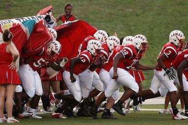 Keywords: football team cheer leaders pep squad pre-game celebration athletes teenagers teens football game high school athletics energetic happy leader sport competition helmets uniforms red people male female texas smiling leadership