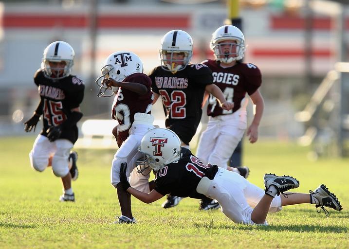 Keywords: football youth league game play youth sports young action outdoors player competition runner running back tackle ball carrier american ball playing athlete grass green team athletic