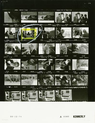 | Keywords: Ford A0083 NLGRF photo contact sheet (1974-08-12)(Gerald Ford Library).jpg White House Photographic Office WHPO is housed at the Gerald R Ford Presidential Library a branch of the National Archives and Records Administration NARA <br/><br/> This file is a 200 dpi photo contact sheet having images from roll of film A0083 of the August 9 1974 - January 20 1977 Gerald R Ford White House Photographic Office Series A0001-A9999 and B0001-B2886 photographs <br/><br/> The date on the photo contact sheet is the date the roll of film was processed not necessarily the date the photographs were taken See table below for additional details 1974-08-12 Gerald R Ford Presidential Library Image http //www fordlibrarymuseum gov/library/whphotos/A0083_NLGRF jpg A0083_NLGRF jpg from http //www fordlibrarymuseum gov/library/whphotos/19740812whpo pdf White House Photographs August 12 1974 of the http //www fordlibrarymuseum gov/Library/whphotos/whpo asp White House Photographic Collection page White House Photographic Office WHPO <br/> Creator David Hume Kennerly PD-USGov Institution Institution Gerald R Ford Presidential Library Table wikitable sortable + Photo contact sheet A0083 U S President Ford Administration Gerald R Ford Library Frame s Tone Subject proper Subject generic Names Geographic Location Photographer Date - 1 BW Kennerly 1974-08-12 - 2-3 BW standing in doorway Rumsfeld White House Kennerly 1974-08-12 - 4-5 BW standing talking Rumsfeld Haig terHorst Outside Oval Office Kennerly 1974-08-12 - 6-7 BW meeting seated around desk GRF Hartmann terHorst Oval Office Kennerly 1974-08-12 - 8-9 BW listening seated at desk GRF Oval Office Kennerly 1974-08-12 - 10-11 BW talking seated at desk GRF Hartmann Oval Office Kennerly 1974-08-12 - 12-15 BW smoking pipe seated at desk GRF Oval Office Kennerly 1974-08-12 - 16 BW hand on face Kissinger Oval Office Kennerly 1974-08-12 - 17 BW smoking pipe GRF Oval Office Kennerly 1974-08-12 - 18-19 BW talking seated at desk GRF Kissinger Oval Office Kennerly 1974-08-12 - 20-22 BW GRF South Lawn Kennerly 1974-08-12 - 23-25 BW 514 Crown View Drive - Alexandria Virginia standing on front walk GRF Alexandria VA Ford Home Kennerly 1974-08-12 - 26-29 BW Address before a Joint Session of Congress making speech GRF Speaker Carl Albert President Pro tem James Eastland House Clerks Capitol Building House Chamber Kennerly 1974-08-12 Gerald R Ford Presidential Library and Museum-cooperation PD-USGov Contact sheets by the Ford White House August 1974 Photographs by David Hume Kennerly from 1974 |