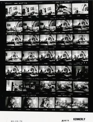 | Keywords: Ford A0575 NLGRF photo contact sheet (1974-09-05)(Gerald Ford Library).jpg White House Photographic Office WHPO is housed at the Gerald R Ford Presidential Library a branch of the National Archives and Records Administration NARA <br/><br/> This file is a 200 dpi photo contact sheet having images from roll of film A0575 of the August 9 1974 - January 20 1977 Gerald R Ford White House Photographic Office Series A0001-A9999 and B0001-B2886 photographs <br/><br/> The date on the photo contact sheet is the date the roll of film was processed not necessarily the date the photographs were taken See table below for additional details 1974-09-05 Gerald R Ford Presidential Library Image http //www fordlibrarymuseum gov/library/whphotos/A0575_NLGRF jpg A0575_NLGRF jpg from http //www fordlibrarymuseum gov/library/whphotos/19740905whpo pdf White House Photographs September 5 1974 of the http //www fordlibrarymuseum gov/Library/whphotos/whpo asp White House Photographic Collection page White House Photographic Office WHPO <br/> Creator David Hume Kennerly PD-USGov Institution Institution Gerald R Ford Presidential Library Table wikitable sortable + Photo contact sheet A0575 U S President Ford Administration Gerald R Ford Library Frame s Tone Subject proper Subject generic Names Geographic Location Photographer Date - 1A-3A BW GRF seated Betty standing GRF Betty Ford Second Floor - West Sitting Hall Kennerly 1974-09-05 - 4A BW GRF standing lighting Betty's cigarette smoking GRF Betty Ford Second Floor - West Sitting Hall Kennerly 1974-09-05 - 5A BW GRF standing smoking pipe removing suit coat GRF Betty Ford Second Floor - West Sitting Hall Kennerly 1974-09-05 - 6A-17A BW sitting talking reading GRF smoking pipe GRF Betty Ford Second Floor - West Sitting Hall Kennerly 1974-09-05 - 18A-24A BW sitting reading; GRF smoking pipe feet on table GRF Betty Ford Second Floor - West Sitting Hall Kennerly 1974-09-05 - 25A BW walking towards Family Dining Room GRF Betty Ford Second Floor - West Sitting Hall Kennerly 1974-09-05 - 26A BW entering Family Dining Room GRF Betty Ford Second Floor - West Sitting Hall Kennerly 1974-09-05 - 27A BW seated talking waiting for dinner GRF Betty Ford Second Floor - Family Dining Room Kennerly 1974-09-05 - 28A BW seated; waiter serving dinner blurred GRF Betty Ford Gene Allen White House waiter Second Floor - Family Dining Room Kennerly 1974-09-05 - 29A-35A BW seated talking eating; various angles GRF Betty Ford Second Floor - Family Dining Room Kennerly 1974-09-05 Gerald R Ford Presidential Library and Museum-cooperation PD-USGov Contact sheets by the Ford White House September 1974 Photographs by David Hume Kennerly from 1974 |