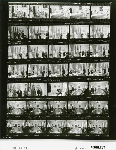 | Keywords: Ford A0922 NLGRF photo contact sheet (1974-09-20)(Gerald Ford Library).jpg White House Photographic Office WHPO is housed at the Gerald R Ford Presidential Library a branch of the National Archives and Records Administration NARA <br/><br/> This file is a 200 dpi photo contact sheet having images from roll of film A0922 of the August 9 1974 - January 20 1977 Gerald R Ford White House Photographic Office Series A0001-A9999 and B0001-B2886 photographs <br/><br/> The date on the photo contact sheet is the date the roll of film was processed not necessarily the date the photographs were taken See table below for additional details 1974-09-20 Gerald R Ford Presidential Library Image http //www fordlibrarymuseum gov/library/whphotos/A0922_NLGRF jpg A0922_NLGRF jpg from http //www fordlibrarymuseum gov/library/whphotos/19740920whpo pdf White House Photographs September 20 1974 of the http //www fordlibrarymuseum gov/Library/whphotos/whpo asp White House Photographic Collection page White House Photographic Office WHPO <br/> Creator David Hume Kennerly PD-USGov Institution Institution Gerald R Ford Presidential Library Table wikitable sortable + Photo contact sheet A0922 U S President Ford Administration Gerald R Ford Library Frame s Tone Subject proper Subject generic Names Geographic Location Photographer Date - 1A-5A BW Governor of Puerto Rico seated near fireplace GRF Rafael Hernandez-Colon Oval Office Kennerly 1974-09-20 - 6A-11A BW May retiring White House photographer; Atkins White House photographer looking at photograph portfolio GRF Buck May Ollie Atkins Oval Office Kennerly 1974-09-20 - 12A-14A BW May retiring White House photographer; Atkins White House photographer standing talking GRF Buck May Ollie Atkins O'Donnell Secret Service Oval Office Kennerly 1974-09-20 - 15A-20A BW May retiring White House photographer; Atkins White House photographer GRF seated at desk others standing -May shooting photographs GRF Buck May Ollie Atkins Oval Office Kennerly 1974-09-20 - 21A BW retiring White House photographer GRF and May handshaking GRF Buck May Secret Service Oval Office Kennerly 1974-09-20 - 22A BW retiring White House photographer walking saying goodbye GRF Buck May Oval Office Kennerly 1974-09-20 - 23A BW Counsel to the President seated on sofa talking on telephone Buchen Scheduling and Advance Office Kennerly 1974-09-20 - 24A-29A BW Meeting to discuss the Economic Policy Speech GRF talking; all standing next to table GRF Timmons Rush Seidman Greenspan Paul McCracken Cabinet Room Kennerly 1974-09-20 - 30A BW Meeting to discuss the Economic Policy Speech sitting down GRF Timmons Rush Seidman Greenspan Paul McCracken Cabinet Room Kennerly 1974-09-20 - 31A-35A BW Meeting to discuss the Economic Policy Speech seated around table GRF Timmons Rush Seidman Greenspan Paul McCracken Hartmann Marsh Buchen Nessen Rustand Cabinet Room Kennerly 1974-09-20 Gerald R Ford Presidential Library and Museum-cooperation PD-USGov Contact sheets by the Ford White House September 1974 Photographs by David Hume Kennerly from 1974 |