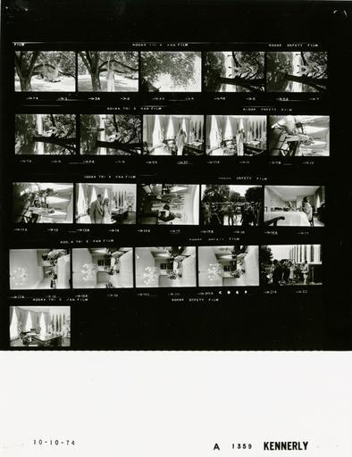 | Keywords: Ford A1359 NLGRF photo contact sheet (1974-10-10)(Gerald Ford Library).jpg White House Photographic Office WHPO is housed at the Gerald R Ford Presidential Library a branch of the National Archives and Records Administration NARA <br/><br/> This file is a 200 dpi photo contact sheet having images from roll of film A1359 of the August 9 1974 - January 20 1977 Gerald R Ford White House Photographic Office Series A0001-A9999 and B0001-B2886 photographs <br/><br/> The date on the photo contact sheet is the date the roll of film was processed not necessarily the date the photographs were taken See table below for additional details 1974-10-10 Gerald R Ford Presidential Library Image http //www fordlibrarymuseum gov/library/whphotos/A1359_NLGRF jpg A1359_NLGRF jpg from http //www fordlibrarymuseum gov/library/whphotos/19741010whpo pdf White House Photographs October 10 1974 of the http //www fordlibrarymuseum gov/Library/whphotos/whpo asp White House Photographic Collection page White House Photographic Office WHPO <br/> Creator David Hume Kennerly PD-USGov Institution Institution Gerald R Ford Presidential Library Table wikitable sortable + Photo contact sheet A1359 U S President Ford Administration Gerald R Ford Library Frame s Tone Subject proper Subject generic Names Geographic Location Photographer Date - 16 BW Visit to see Betty Ford following her cancer surgery - Bethesda Maryland GRF walking from limousine; media in background GRF Secret Service Military Media Bethesda MD Sidewalk outside Bethesda Naval Hospital Kennerly 1974-10-10 - 17-21 BW Visit to see Betty Ford following her cancer surgery - Bethesda Maryland seated at table talking eating GRF Betty Ford Bethesda MD Bethesda Naval Hospital - President's Suite Kennerly 1974-10-10 - 22 BW Impromptu Press Conference after visit to see Betty Ford following her cancer surgery -Bethesda Maryland GRF speaking at microphone media and hospital in background GRF Secret Service military Media Bethesda MD Sidewalk outside Bethesda Naval Hospital Kennerly 1974-10-10 - 23 BW walking behind desk removing jacket GRF Oval Office Kennerly 1974-10-10 - 6-9 BW Pet Golden Retriever climbing tree sitting on branch; Liberty seated on lawn below Susan Ford Liberty South Lawn Kennerly 1974-10-10 - 10-11 BW Pet Golden Retriever standing near desk Susan kissing GRF; Liberty standing nearby GRF Susan Ford Liberty Oval Office Kennerly 1974-10-10 - 12-13 BW Pet Golden Retriever standing near desk talking; Liberty standing nearby GRF Susan Ford Liberty Oval Office Kennerly 1974-10-10 - 14 BW walking away from desk GRF Susan Ford Oval Office Kennerly 1974-10-10 - 15 BW standing talking near desk GRF Susan Ford Maj Barrett Oval Office Kennerly 1974-10-10 - 3-4 BW climbing tree holding on to branches Susan Ford South Lawn Kennerly 1974-10-10 - 5 BW Kennerly 1974-10-10 Gerald R Ford Presidential Library and Museum-cooperation PD-USGov Contact sheets by the Ford White House October 1974 Photographs by David Hume Kennerly from 1974 |
