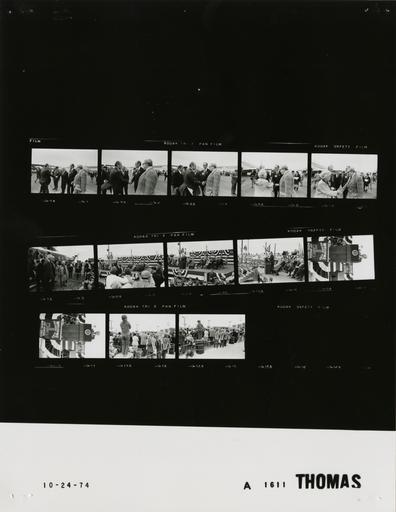 | Keywords: Ford A1611 NLGRF photo contact sheet (1974-10-24)(Gerald Ford Library).jpg White House Photographic Office WHPO is housed at the Gerald R Ford Presidential Library a branch of the National Archives and Records Administration NARA <br/><br/> This file is a 200 dpi photo contact sheet having images from roll of film A1611 of the August 9 1974 - January 20 1977 Gerald R Ford White House Photographic Office Series A0001-A9999 and B0001-B2886 photographs <br/><br/> The date on the photo contact sheet is the date the roll of film was processed not necessarily the date the photographs were taken See table below for additional details 1974-10-24 Gerald R Ford Presidential Library Image http //www fordlibrarymuseum gov/library/whphotos/A1611_NLGRF jpg A1611_NLGRF jpg from http //www fordlibrarymuseum gov/library/whphotos/19741024whpo pdf White House Photographs October 24 1974 of the http //www fordlibrarymuseum gov/Library/whphotos/whpo asp White House Photographic Collection page White House Photographic Office WHPO - Thomas PD-USGov Institution Institution Gerald R Ford Presidential Library Table wikitable sortable + Photo contact sheet A1611 U S President Ford Administration Gerald R Ford Library Frame s Tone Subject proper Subject generic Names Geographic Location Photographer Date - 2A-6A BW Arrival in Illinois; Prior to helicopter flight to Melvin Illinois; Widow of late Senator from Illinois - Chicago Illinois greeting handshaking on tarmac - all not in every frame; Air Force One in background GRF Burch Louella Dirksen George Burdit Clifford Carlson Col Jack Reilly Chicago IL O'Hare International Airport Thomas 1974-10-24 - 7A BW Arrival for Honor Les Arends Day ; United States Representative from Illinois IL Widow of late Senator from Illinois - Melvin Illinois standing near Marine One GRF Burch Louella Dirksen Rep Mrs Arends Others Melvin IL Melvin City Little League Park Thomas 1974-10-24 - 8A-9A BW Honor Les Arends Day ; United States Representative from Illinois IL Widow of late Senator from Illinois - Melvin Illinois Unidentified man standing at podium others seated; crowd in foreground GRF Burch Louella Dirksen Rep Mrs Arends Platform Guests Others Melvin IL Ford County Fairgrounds Thomas 1974-10-24 - 10A-12A BW Honor Les Arends Day ; United States Representative from Illinois IL Widow of late Senator from Illinois - Melvin Illinois GRF standing at podium others seated - various angles and distances all not in every frame GRF Burch Louella Dirksen Rep Mrs Arends Platform Guests Others Melvin IL Ford County Fairgrounds Thomas 1974-10-24 - 13A-14A BW Following GRF Speech on Honor Les Arends Day ; United States Representative from Illinois IL Widow of late Senator from Illinois - Melvin Illinois all standing - long shot taken from behind crowd difficult to see platform GRF Burch Louella Dirksen Rep Mrs Arends Platform Guests Crowd Melvin IL Ford County Fairgrounds Thomas 1974-10-24 Gerald R Ford Presidential Library and Museum-cooperation PD-USGov Contact sheets by the Ford White House October 1974 |