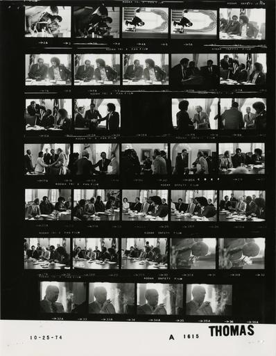 | Keywords: Ford A1615 NLGRF photo contact sheet (1974-10-25)(Gerald Ford Library).jpg White House Photographic Office WHPO is housed at the Gerald R Ford Presidential Library a branch of the National Archives and Records Administration NARA <br/><br/> This file is a 200 dpi photo contact sheet having images from roll of film A1615 of the August 9 1974 - January 20 1977 Gerald R Ford White House Photographic Office Series A0001-A9999 and B0001-B2886 photographs <br/><br/> The date on the photo contact sheet is the date the roll of film was processed not necessarily the date the photographs were taken See table below for additional details 1974-10-25 Gerald R Ford Presidential Library Image http //www fordlibrarymuseum gov/library/whphotos/A1615_NLGRF jpg A1615_NLGRF jpg from http //www fordlibrarymuseum gov/library/whphotos/19741025whpo pdf White House Photographs October 25 1974 of the http //www fordlibrarymuseum gov/Library/whphotos/whpo asp White House Photographic Collection page White House Photographic Office WHPO - Thomas PD-USGov Institution Institution Gerald R Ford Presidential Library Table wikitable sortable + Photo contact sheet A1615 U S President Ford Administration Gerald R Ford Library Frame s Tone Subject proper Subject generic Names Geographic Location Photographer Date - 2A-3A BW Prior to Meeting with Civil Rights Leaders seated talking at table Clarence Mitchell Dorothy Height Pauline Ellison Carlton Goodlett Bayard Rustin Cabinet Room Thomas 1974-10-25 - 4A-5A BW Prior to Meeting with Civil Rights Leaders - Special Assistant for Minority Affairs seated on couch reading hand on glasses Stanley Scott Scheduling and Advance Office Thomas 1974-10-25 - 6A-9A BW Prior to Meeting with Civil Rights Leaders - Executive Director Urban League; National President Operation PUSH seated talking at table Vernon Jordan Rev Jesse Jackson Cabinet Room Thomas 1974-10-25 - 10A BW Prior to Meeting with Civil Rights Leaders - Deputy Special Assistant for Minority Affairs; President Southern Christian Leadership Conference seated talking Calhoun Unidentified Ralph Abernathy Cabinet Room Thomas 1974-10-25 - 11A-12A BW Prior to Meeting with Civil Rights Leaders - Deputy Special Assistant for Minority Affairs; Executive Director Urban League; National President Operation PUSH Calhoun leaning on chair others seated at table Calhoun Vernon Jordan Rev Jesse Jackson Cabinet Room Thomas 1974-10-25 - 13A BW Prior to Meeting with Civil Rights Leaders - Executive Director Urban League; National President Operation PUSH standing; Rumsfeld and Rev Jesse Jackson handshaking Rumsfeld Vernon Jordan Rev Jesse Jackson Cabinet Room Thomas 1974-10-25 - 14A BW Prior to Meeting with Civil Rights Leaders - Executive Director Urban League; National President Operation PUSH standing; Rumsfeld and Rev Jesse Jackson handshaking Rev Jesse Jackson Thomas 1974-10-25 - 15A BW Prior to Meeting with Civil Rights Leaders - National President Operation PUSH handshaking GRF Rev Jesse Jackson Cabinet Room Thomas 1974-10-25 - 16A BW Prior to Meeting with Civil Rights Leaders - Executive Director Urban League; National President Operation PUSH standing talking; Jordan back to camera GRF Vernon Jordan Rev Jesse Jackson Cabinet Room Thomas 1974-10-25 - 17A-19A BW Prior to Meeting with Civil Rights Leaders greeting handshaking GRF Scott Participants Cabinet Room Thomas 1974-10-25 - 20A BW Prior to Meeting with Civil Rights Leaders - Chairman Opportunities Industrial Centers of America Inc greeting handshaking GRF Rev Leon Sullivan Cabinet Room Thomas 1974-10-25 - 21A-22A BW Meeting with Civil Rights Leaders -Executive Director Urban League; National President Operation PUSH seated at table talking GRF Vernon Jordan Rev Jesse Jackson Cabinet Room Thomas 1974-10-25 - 23A BW Meeting with Civil Rights Leaders - Executive Director Urban League; National President Operation PUSH seated at table talking Scott GRF Vernon Jordan Rev Jesse Jackson Cabinet Room Thomas 1974-10-25 - 24A-25A BW Meeting with Civil Rights Leaders - President National Council of Negro Women seated at table talking Dorothy Height Scott GRF Vernon Jordan Rev Jesse Jackson Cabinet Room Thomas 1974-10-25 - 26A-29A BW Meeting with Civil Rights Leaders - Executive Director Urban League; National President Operation PUSH seated at table talking Scott GRF Vernon Jordan Rev Jesse Jackson Cabinet Room Thomas 1974-10-25 - 30A-35A BW Meeting with Civil Rights Leaders smoking pipe; wafts of smoke around head -backlit head and shoulder portrait s GRF Cabinet Room Thomas 1974-10-25 Gerald R Ford Presidential Library and Museum-cooperation PD-USGov Contact sheets by the Ford White House October 1974 Civil rights activists from the United States ¢ Ralph David Abernathy ¢ Jesse Jackson ¢ Vernon Jordan ¢ |