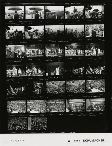 Keywords: Ford A1667 NLGRF photo contact sheet (1974-10-29)(Gerald Ford Library).jpg White House Photographic Office WHPO is housed at the Gerald R Ford Presidential Library a branch of the National Archives and Records Administration NARA <br/><br/> This file is a 200 dpi photo contact sheet having images from roll of film A1667 of the August 9 1974 - January 20 1977 Gerald R Ford White House Photographic Office Series A0001-A9999 and B0001-B2886 photographs <br/><br/> The date on the photo contact sheet is the date the roll of film was processed not necessarily the date the photographs were taken See table below for additional details 1974-10-29 Gerald R Ford Presidential Library Image http //www fordlibrarymuseum gov/library/whphotos/A1667_NLGRF jpg A1667_NLGRF jpg from http //www fordlibrarymuseum gov/library/whphotos/19741029whpo pdf White House Photographs October 29 1974 of the http //www fordlibrarymuseum gov/Library/whphotos/whpo asp White House Photographic Collection page White House Photographic Office WHPO - Schumacher PD-USGov Institution Institution Gerald R Ford Presidential Library Table wikitable sortable + Photo contact sheet A1667 U S President Ford Administration Gerald R Ford Library Frame s Tone Subject proper Subject generic Names Geographic Location Photographer Date - 4-10 BW Trip to Grand Rapids Michigan greeting handshaking mingling -umbrellas prominent GRF Crowd Grand Rapids MI Kent County Airport Schumacher 1974-10-29 - 11-12 BW Trip to Grand Rapids Michigan GRF walking waving GRF Crowd Secret Service Grand Rapids MI Downtown Street Schumacher 1974-10-29 - 13-14 BW Trip to Grand Rapids Michigan mingling handshaking greeting GRF Crowd Secret Service Grand Rapids MI Downtown Street Schumacher 1974-10-29 - 15-16 BW Welcome Home Rally Sponsored by Friends of the First Family ; Governor of Michigan; Mayor of Grand Rapids - Grand Rapids Michigan standing on podium Gov Milliken GRF Mayor Parks Althea Bennett Others Grand Rapids MI Calder Plaza Schumacher 1974-10-29 - 17 BW Welcome Home Rally Sponsored by Friends of the First Family ; Governor of Michigan; Mayor of Grand Rapids - Grand Rapids Michigan GRF waving near front of platform; others in background Gov Milliken GRF Mayor Parks Althea Bennett Others Grand Rapids MI Calder Plaza Schumacher 1974-10-29 - 18-20 BW Welcome Home Rally Sponsored by Friends of the First Family ; Governor of Michigan; Mayor of Grand Rapids - Grand Rapids Michigan GRF getting cookies from Bennett Gov Milliken GRF Mayor Parks Althea Bennett Others Grand Rapids MI Calder Plaza Schumacher 1974-10-29 - 21 BW Welcome Home Rally Sponsored by Friends of the First Family -Grand Rapids Michigan waving near podium GRF Grand Rapids MI Calder Plaza Schumacher 1974-10-29 - 22 BW Welcome Home Rally Sponsored by Friends of the First Family -Grand Rapids Michigan GRF at podium; crowd in foreground -long shot from rear of plaza GRF Platform Guests Crowd Grand Rapids MI Calder Plaza Schumacher 1974-10-29 - 23-25 BW Welcome Home Rally Sponsored by Friends of the First Family -Grand Rapids Michigan GRF at podium; crossed flags in foreground -long shot from rear of plaza GRF Platform Guests Crowd Grand Rapids MI Calder Plaza Schumacher 1974-10-29 - 26-31 BW Goebel For Congress Rally - Grand Rapids Michigan GRF at podium; crowd in background -long high shot taken from right of GRF GRF Platform Guests Crowd Grand Rapids MI Calvin College - Knollcrest Fieldhouse Schumacher 1974-10-29 - 32-33 BW Goebel For Congress Rally - Grand Rapids Michigan GRF at podium; crowd on right - close range GRF Platform Guests Crowd Grand Rapids MI Calvin College - Knollcrest Fieldhouse Schumacher 1974-10-29 - 34-35 BW Goebel For Congress Rally - Grand Rapids Michigan GRF walking off platform; crowd on right - high long shot from right of platform GRF Platform Guests Crowd Grand Rapids MI Calvin College - Knollcrest Fieldhouse Schumacher 1974-10-29 Gerald R Ford Presidential Library and Museum-cooperation PD-USGov Contact sheets by the Ford White House October 1974 |