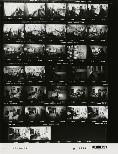 | Keywords: Ford A1685 NLGRF photo contact sheet (1974-10-30)(Gerald Ford Library).jpg White House Photographic Office WHPO is housed at the Gerald R Ford Presidential Library a branch of the National Archives and Records Administration NARA <br/><br/> This file is a 200 dpi photo contact sheet having images from roll of film A1685 of the August 9 1974 - January 20 1977 Gerald R Ford White House Photographic Office Series A0001-A9999 and B0001-B2886 photographs <br/><br/> The date on the photo contact sheet is the date the roll of film was processed not necessarily the date the photographs were taken See table below for additional details 1974-10-30 Gerald R Ford Presidential Library Image http //www fordlibrarymuseum gov/library/whphotos/A1685_NLGRF jpg A1685_NLGRF jpg from http //www fordlibrarymuseum gov/library/whphotos/19741030whpo pdf White House Photographs October 30 1974 of the http //www fordlibrarymuseum gov/Library/whphotos/whpo asp White House Photographic Collection page White House Photographic Office WHPO <br/> Creator David Hume Kennerly PD-USGov Institution Institution Gerald R Ford Presidential Library Table wikitable sortable + Photo contact sheet A1685 U S President Ford Administration Gerald R Ford Library Frame s Tone Subject proper Subject generic Names Geographic Location Photographer Date - 8 BW Prior to Cabinet Meeting on the Economy -Chairman of the Republican National Committee RNC standing talking GRF Mary Louise Smith Cabinet Room Kennerly 1974-10-30 - 9-19 BW Cabinet Meeting on the Economy standing around table talking; various angles all not in every frame GRF Robert Ingersoll Stephen Gardner Schlesinger Laurence Silberman Morton Butz Dent Brennan Frank Carlucci Lynn Brinegar John Barnum Ash Amstrong Hartmann Marsh Rumsfeld Mary Louise Smith Cole Greenspan Seidman Train Cheney Others Cabinet Room Kennerly 1974-10-30 - 20-22 BW Preparations for Greeting Trick or Treaters carving Halloween Pumpkin Susan Ford Children Others Truman Balcony Kennerly 1974-10-30 - 23-24 BW Halloween Preparations dressing skeleton lying on President's chair Betty Ford Nancy Howe Second Floor - President's Private Study Kennerly 1974-10-30 - 25 BW Halloween Preparations walking past skeleton lying on President's chair Betty Ford Second Floor - President's Private Study Kennerly 1974-10-30 - 26-30 BW Halloween Preparations walking past skeleton lying on President's chair Betty Ford Howe Susan Ford Children Others Second Floor - President's Private Study Kennerly 1974-10-30 - 31-34 BW Discussion of Therapy for Mrs Ford -Betty Ford's Surgeon seated talking Betty Ford Howe Lukash Dr William Prouty White House Basement -Infirmary Kennerly 1974-10-30 - 3-4 BW Prior to Cabinet Meeting on the Economy -Secretary of the Interior standing leaning against chair looking at charts Sec Morton Cabinet Room Kennerly 1974-10-30 - 5 BW Prior to Cabinet Meeting on the Economy Seidman and Scowcroft standing talking; Buchen seated nearby at table Seidman Scowcroft Buchen Cabinet Room Kennerly 1974-10-30 - 6-7 BW Prior to Cabinet Meeting on the Economy -Secretary of Agriculture standing talking Scowcroft Sec Butz Cabinet Room Kennerly 1974-10-30 Gerald R Ford Presidential Library and Museum-cooperation PD-USGov Contact sheets by the Ford White House October 1974 Photographs by David Hume Kennerly from 1974 |