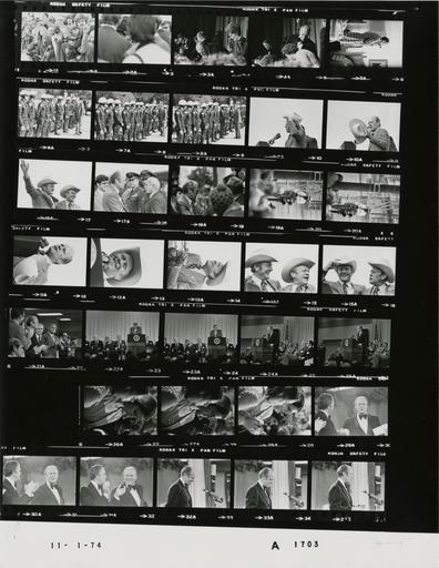 Keywords: Ford A1703 NLGRF photo contact sheet (1974-10-31)(Gerald Ford Library).jpg White House Photographic Office WHPO is housed at the Gerald R Ford Presidential Library a branch of the National Archives and Records Administration NARA <br/><br/> This file is a 200 dpi photo contact sheet having images from roll of film A1703 of the August 9 1974 - January 20 1977 Gerald R Ford White House Photographic Office Series A0001-A9999 and B0001-B2886 photographs <br/><br/> The date on the photo contact sheet is the date the roll of film was processed not necessarily the date the photographs were taken See table below for additional details 1974-10-31 Gerald R Ford Presidential Library Image http //www fordlibrarymuseum gov/library/whphotos/A1703_NLGRF jpg A1703_NLGRF jpg from http //www fordlibrarymuseum gov/library/whphotos/19741031whpo pdf White House Photographs October 31 1974 of the http //www fordlibrarymuseum gov/Library/whphotos/whpo asp White House Photographic Collection page White House Photographic Office WHPO <br/> Creator David Hume Kennerly PD-USGov Institution Institution Gerald R Ford Presidential Library Table wikitable sortable + Photo contact sheet A1703 U S President Ford Administration Gerald R Ford Library Frame s Tone Subject proper Subject generic Names Geographic Location Photographer Date - 3A-4A BW California Republican Fundraising Dinner - Los Angeles California sitting down; all not in every frame GRF Ronald Nancy Reagan Others Los Angeles CA Century Plaza Hotel - Pacific Palisades Room Kennerly 1974-10-31 - 1A BW Awaiting Departure from Trip to Iowa -Sioux City Iowa standing behind rope Crowd Sioux City IA Sioux City Municipal Airport Kennerly 1974-10-31 - 2A BW Departure from Trip to Iowa - Sioux City Iowa close-up of backs Crowd Sioux City IA Sioux City Municipal Airport Kennerly 1974-10-31 - 5A BW Trip to California -Los Angeles California standing between beds; on telephone smoking pipe; in housecoat GRF Los Angeles CA Century Plaza Hotel - President's Suite Kennerly 1974-11-01 - 6A-8A BW Prior to Departure from Long Beach -Long Beach California handshaking thanking saying goodbye GRF Motorcycle Patrolmen Long Beach CA Long Beach Airport Kennerly 1974-11-01 - 9A-13A BW Arrival for Campaign Rally for Rep Mathias; Hat Gift from Dennis Prindiville Mayor Clovis California - Fresno California speaking at podium; holding wearing cowboy hat GRF Fresno CA Fresno Airport Kennerly 1974-11-01 - 14A-16A BW Arrival for Campaign Rally for Rep Mathias; United States Representative from California; Hat Gift from Dennis Prindiville Mayor Clovis California - Fresno California standing at podium waving wearing cowboy hats GRF Rep Mathias Fresno CA Fresno Airport Kennerly 1974-11-01 - 17A BW Arrival for Trip to Oregon - Portland Oregon greeting handshaking GRF Welcoming Committee Portland OR Portland International Airport Kennerly 1974-11-01 - 18A BW Arrival for Trip to Oregon - Portland Oregon greeting handshaking GRF Crowd Portland OR Portland International Airport Kennerly 1974-11-01 - 19A-20A BW Trip to Oregon - Portland Oregon standing on traffic light Unidentified Man Portland OR Portland International Airport Kennerly 1974-11-01 - 21A BW Prior to White House Conference on Domestic and Economic Affairs - Portland Oregon GRF standing; others standing applauding GRF Others Portland OR Portland Memorial Coliseum -Convention Hall Kennerly 1974-11-01 - 22A-23A BW White House Conference on Domestic and Economic Affairs - Portland Oregon Man introducing GRF others seated GRF Platform Participants Portland OR Portland Memorial Coliseum -Convention Hall Kennerly 1974-11-01 - 24A-25A BW White House Conference on Domestic and Economic Affairs - Portland Oregon GRF speaking at podium; taken from right of room GRF Platform Participants Crowd Portland OR Portland Memorial Coliseum -Convention Hall Kennerly 1974-11-01 - 26A-28A BW White House Conference on Domestic and Economic Affairs - Portland Oregon seated listening Women in Crowd Portland OR Portland Memorial Coliseum -Convention Hall Kennerly 1974-11-01 - 29A-31A BW Oregon Museum of Science and Industry 15th Annual Auction; United States Senator from Oregon OR - Portland Oregon standing Packwood applauding; formal wear GRF Sen Packwood Portland OR Portland Memorial Coliseum Kennerly 1974-11-01 - 32A-34A BW Oregon Museum of Science and Industry 15th Annual Auction; United States Senator from Oregon OR - Portland Oregon standing at microphone accepting applause; wearing tuxedo GRF Portland OR Portland Memorial Coliseum Kennerly 1974-11-01 Gerald R Ford Presidential Library and Museum-cooperation PD-USGov Contact sheets by the Ford White House October 1974 Photographs by David Hume Kennerly from 1974 |